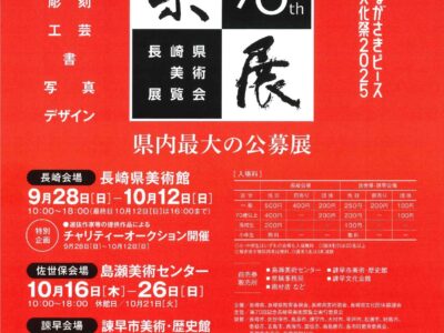 【主催者から一言】 長崎県美術展覧会(県展)は、広く県民から美術作品を公募し、県民の芸術鑑賞・参加機会の創出と美術活動を普及促進することで、芸術文化の振興を図ることを目的に行われている県内最大の公募展です。 部門は以下の … 続きを読む 第70回記念長崎県美術展覧展