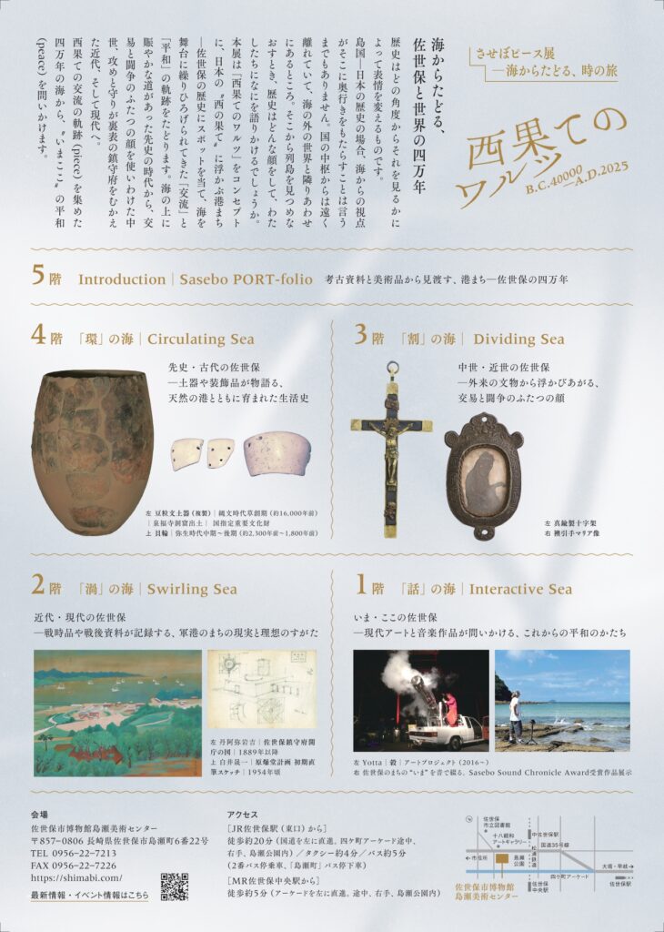 このたび、佐世保市博物館島瀬美術センター(しまび)では、文化芸術を通して長崎から平和を発信する 「ながさきピース文化祭2025」の開催に合わせ、旧石器時代から今日にいたる佐世保の歴史を回顧する特別展 西果てのワルツ「させぼピース展―海からたどる、時の旅」を10月31日(金)から11月30日(日)まで、開催する運びとなりました。