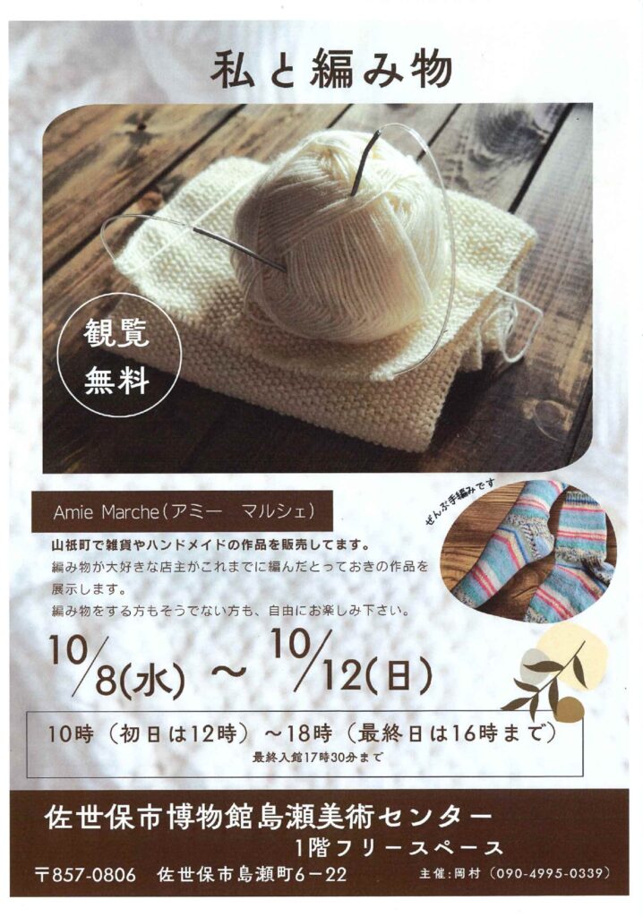 開催中/開催予定はこちら終了した特別展/企画展/収蔵品展私と編み物 【主催者から一言】 編み物作品の展示です。初めての展覧会です。会期2025年10月8日(水)〜10月12日(日)休館日なし時間10時〜18時(入館は17時30分まで)10月8日(水)は12時から、10月12日(日)は16時まで会場1階フリースペース入場料無料 主催岡村 奈祐