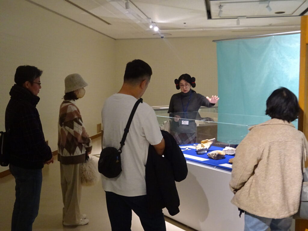 館長は、佐世保の古代から昭和に至るまで、多彩な資料について約1時間にわたり解説。今日のトークでは、壱岐市教育委員会より借用したマンモスの骨を取りあげ、氷河期の旧石器時代には日本列島が大陸とほぼ地続きで、大型動物が生息していたことを紹介。また、松浦史料博物館所蔵《伊能図》に描かれた佐世保周辺の様子、宇都宮美術館より借用したジョルジュ・ビゴーによる《釣りの勝負》《長崎事件》《社交界に出入りする紳士淑女》などの風刺画についても丁寧に解説しました。