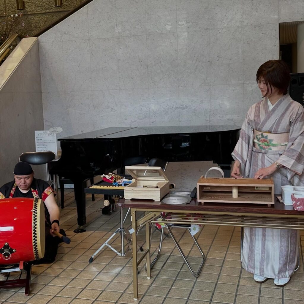 今回のコンサートでは、「繊細な静寂」と「力強い鼓動」の響演をお楽しみいただきました。まずは、オルゴール奏者の松永秋子さんによる演奏。樹齢200年の飫肥杉(おびすぎ)から切り出された「w-faceオルゴール」の音色が流れると、会場は一瞬にして深い静寂に包まれました。その清らかな調べは、まるで宮崎の深い森の中に佇んでいるかのような心地よさを運んでくれます。