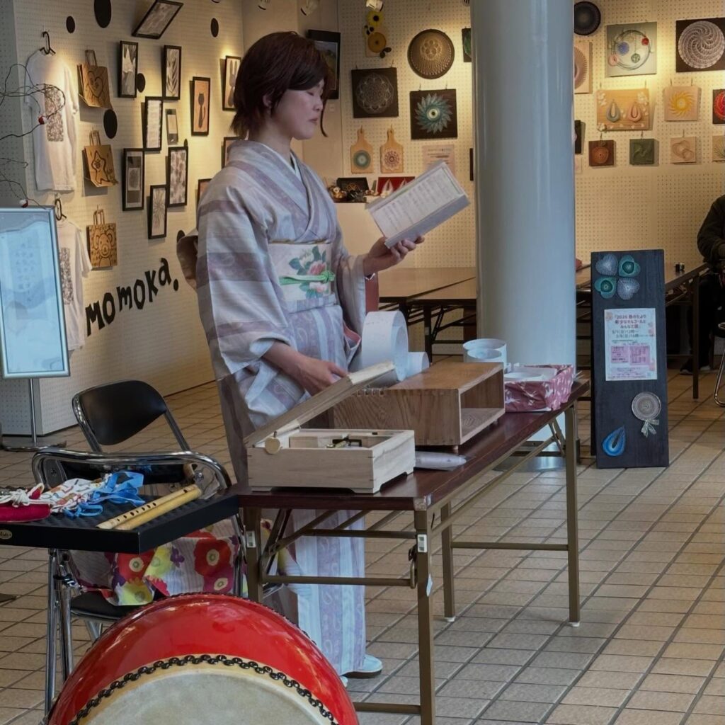 中盤では、オルゴールの音色に乗せた絵本『ぼくがラーメンたべてるとき』と娘を事故で亡くした母の手紙の朗読も。そしてクライマックスは、オルゴール、レインスティック、グングルー、太鼓による共演です。