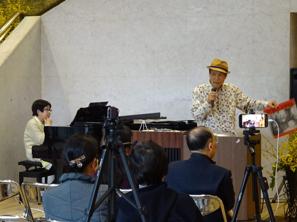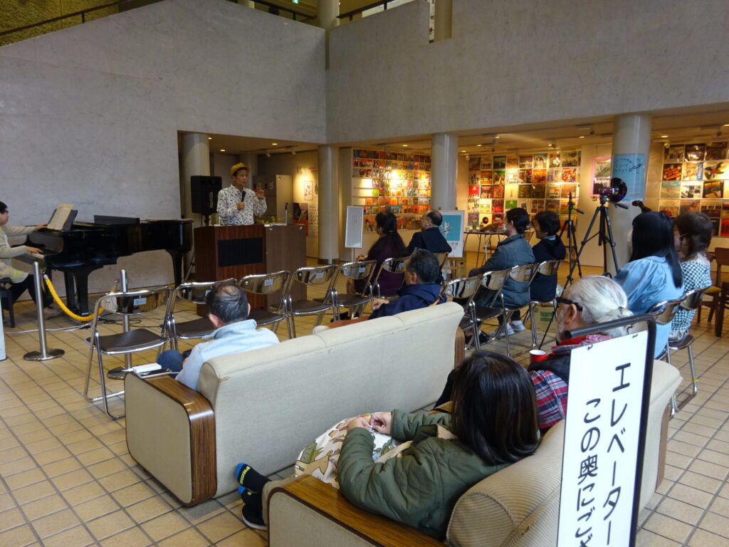 3月22日(月)14時から1階ロビーでレコードジャケットに関するトークイベントが行なわれました。こちらは「ノジーマの世界レコードジャケット展 第9回 海だ、エレキだ、サーフィンだ!!」の関連イベントです。