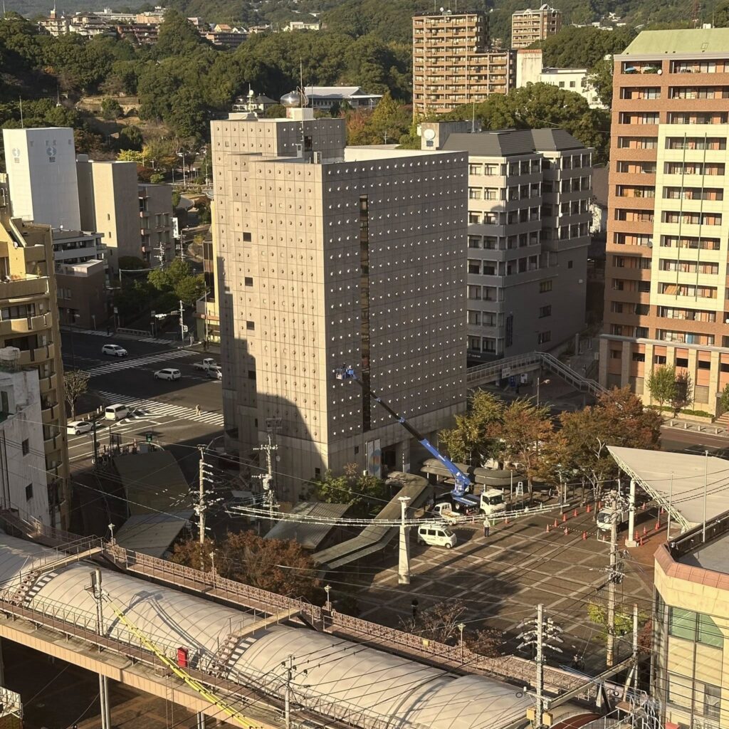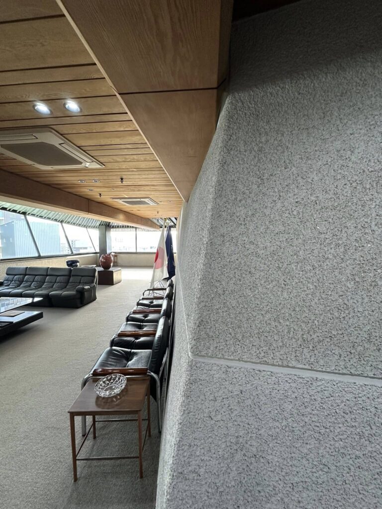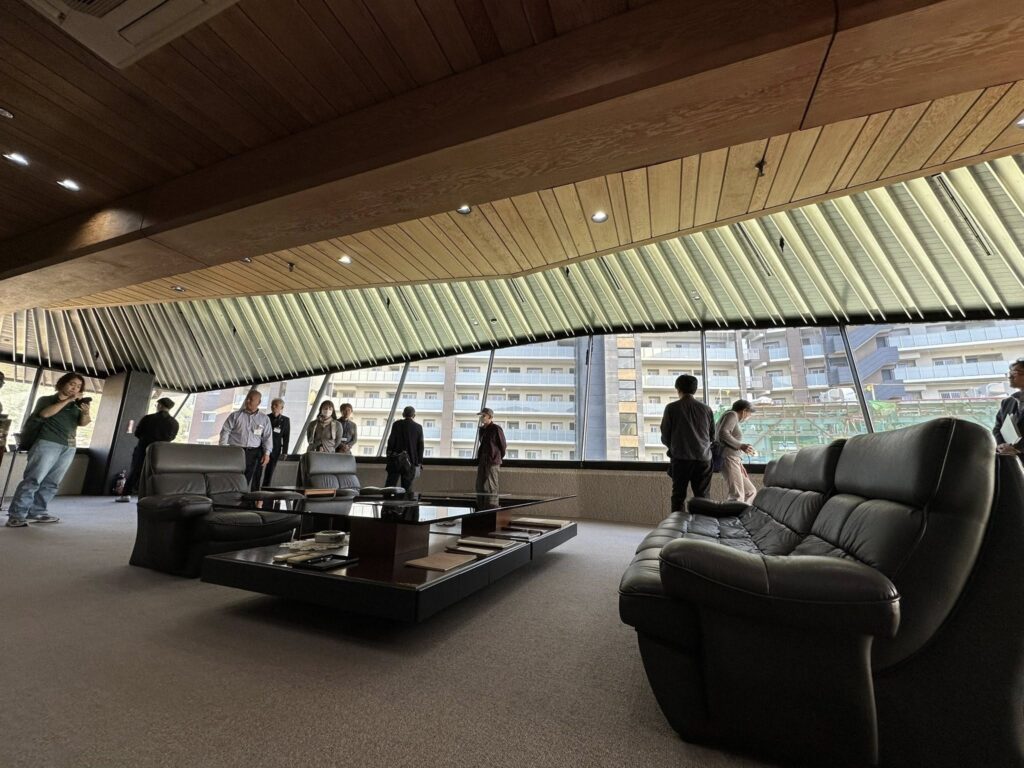 続いて懐霄館へ。十八親和銀行の山本康一さんのご案内で、1時間にわたり、1階から11階までじっくりと見学。砂岩や大理石、木材など自然素材を巧みに用い、楕円形や非対称の壁面、天井照明が織りなす空間美、そして職人たちの高い技術によって築かれた建築の魅力を改めて感じました。